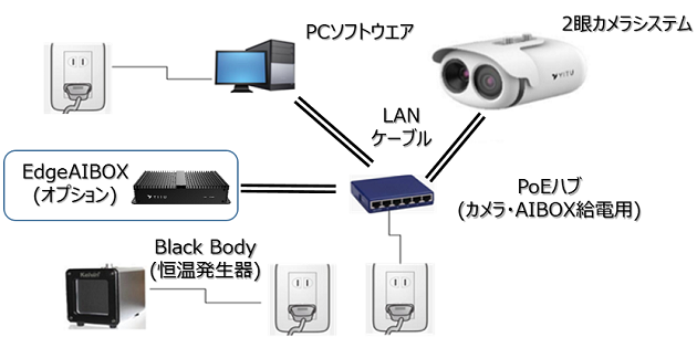 2眼カメラ (高精度カメラ+サーモカメラ)とBlack Bodyを組み合わせたシステム。高い精度でのサーモグラフィ観測と緻密な校正で±0.3℃以下での測定を実現。加えて0.1秒未満で16名の体温を同時にスクリーニング可能です。
