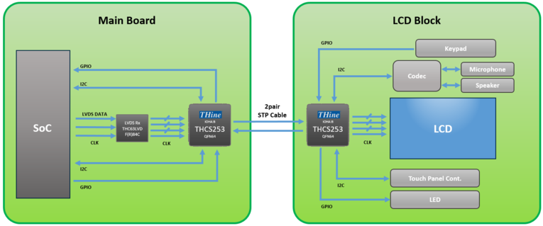 THCS253間は2ペアの差動信号ライン(4本)で送ることができ、狭い隙間を少ない配線数で簡単に通すことができます。パラレルの映像信号、LEDやボタンのH/L信号、I2Cでの制御信号を全て束ね、双方向に伝送します。こうすることで、操作パネルボードへのヒンジ部通過を可能にします。同時に、配線本数を減らす省配線施策により、システムのトータルコストを下げることが可能となります。