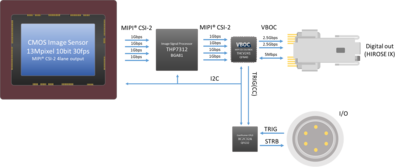 また上図の画像センサ構成イメージでは画像出力としてCameraLinkの代わりにVBOCを使用しています。VBOCはCameraLinkに代わる高速広帯域カメラインターフェースであり、CameraLink Full Configurationの2倍以上のデータをCameraLinkケーブル1本で安定的に伝送することができます。