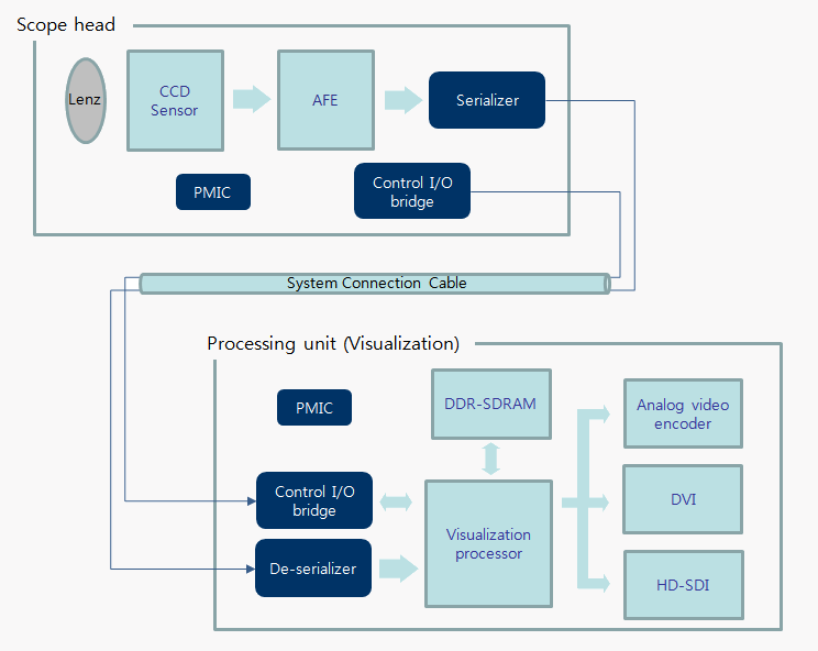 イメージセンサーの高解像度化に伴いスコープとビデオプロセッサ間の接続も画質劣化の伴わないデジタル・ビデオインターフェースが必要とされています。デジタル化の弊害として不要輻射の増加や伝送距離の問題がありますが、V-by-One®HSに対応したTHCVシリーズは他製品に比べて不要輻射を低く抑えながら画質劣化のない伝送を実現します。またアナログ・ビデオ信号に用いられる同軸ケーブルと比べて外径が細いツイナックス・ケーブルを使用できるためスコープの取り回しも容易になります。