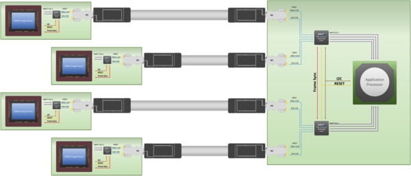 この様なマルチカメラシステムにおいて、カメラ間のフレーム同期が必要となることがあります。この場合、THCV242の外部同期信号入力端子よりフレーム同期信号を入力する、或いはTHCV242内部で生成されたフレーム内部同期信号をSub-Link経由で各カメラへ送ることによりカメラ間のフレーム同期が可能です。ただし使用するイメージセンサに外部同期入力が必要です。