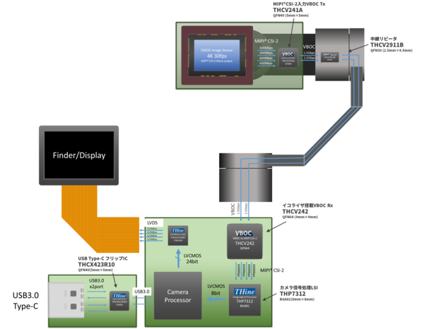 ジンバルカメラに搭載されるスリップリングは、PTZカメラのものと比べて引き出し線長が短く、スリップリング回転体の直径が小さいため信号損失やインピーダンス整合の観点では有利です。しかし回転軸数は2軸から3軸に増え、引き出し線は細いものが使用されるため、伝送系全体でみると必ずしも良い条件とは言えません。またスリップリングは回転体やブラシ形状、接点位置で電気的特性が大きく異なるため、実環境での評価が重要です。信号損失が大きい場合や差動信号の片側を固定したシングルエンド信号による伝送をお考えの場合は、必要に応じてリピータIC”THCV2911B”をご使用ください。