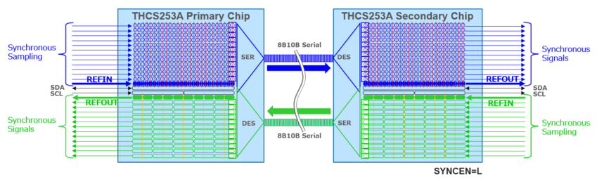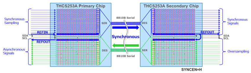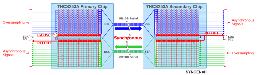 次に、もう1つの大きな変更である同期/非同期モードの導入について説明しよう。従来品であるTHCS251/THCS252は同期モードしか使えなかったが、今回のTHCS253A/THCS254Aでは同期モードと非同期モードの両方を利用できるようになった。使用するモードは、セカンダリ・チップの端子設定でユーザーが選択できる。