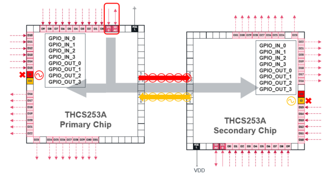 具体的に説明しよう。THCS253A/THCS254Aを電子機器に適用する場合、同じチップ(IC)を2個用意して、一方をプライマリ・チップに、もう一方をセカンダリ・チップにPSSEL端子を使って指定する。扱えるGPIOの本数はTHCS253Aが最大32本、THCS254Aが最大20本である。例えば、THCS253Aの場合、デフォルトでGPI(汎用入力)が16本と、GPO(汎用出力)が16本という端子構成に設定されている(図1)。