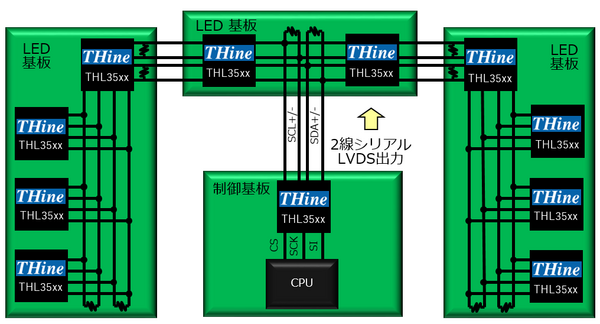既存品のTHL3512/THL3514は、カスケード方式もしくはマルチドロップ方式の接続に向けたインターフェースに特徴があった。具体的には、2ペアのLVDSインターフェース(2線式シリアルLVDS)を採用した。LVDSは差動伝送方式を採用しているため、コモンモード・ノイズに対する耐性が高いというメリットがある。