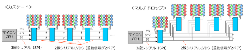 ただしその一方で、LVDSインターフェースにはデメリットも存在する。それは、差動伝送方式を採用しているためシングルエンド伝送方式に比べると、配線本数が増えてしまうことだ。「コモンモード・ノイズ耐性が高いことは歓迎すべきことだが、配線本数が増えることによるプリント基板上の実装面積の増大は避けたい」。こうした設計思想の違いから、LVDSインターフェースを載せたLEDドライバの採用に二の足を踏む電子機器メーカーがあったことも事実だ。