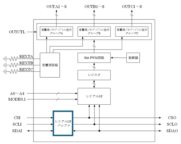 1つ目は、当社の既存品に引き続き、LEDドライバを接続するインターフェースにバッファ回路を内蔵したことである(図6)。このバッファ回路は、リピータ、もしくはリドライバとして機能する。つまり、インターフェースに流れるシングルエンド信号(TTL信号)を受信した後に信号の波形を整形して、再び送出する。このためインターフェースの伝送距離距離を延ばすことが可能になる。前述の通り、アミューズメント機器やアーケード・ゲーム機、デジタル・サイネージなどは、本体サイズが大きい。このため隣り合うLEDドライバとの間隔が長くなってしまうケースが少なくない。今回の製品は、バッファ回路を内蔵したため、こうしたケースにも対応できる。