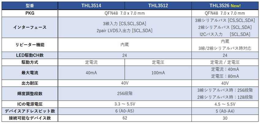 そこで当社は、こうした「声」に対応すべく、電飾用LEDドライバの製品ラインナップを拡充した。今回新たに製品化したのは「THL3526」である(表1)。LVDSインターフェースは採用していない。LEDドライバ同士の接続は、3線式シリアル・インターフェース(SPI)、2線式シリアル・インターフェース(SPI)、I2Cインターフェースのいずれかを端子設定で選択できる。いずれもシングルエンド伝送方式であるため、配線本数が増えることはない。「プリント基板上の実装面積の増大は避けたい」と考える電子機器メーカーには、最適な製品だと言えるだろう。