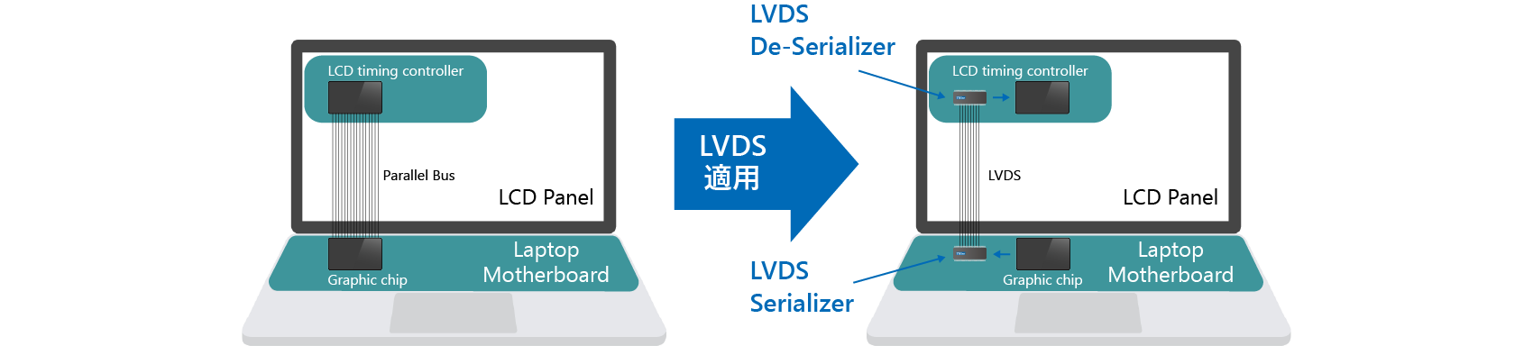 こうしたトラブルを解決する救世主となったのが1995年に登場したLVDS物理層を使用したシリアライザ(Serializer)とデシリアライザ(Deserializer)、すなわちLVDS SerDes ICである。