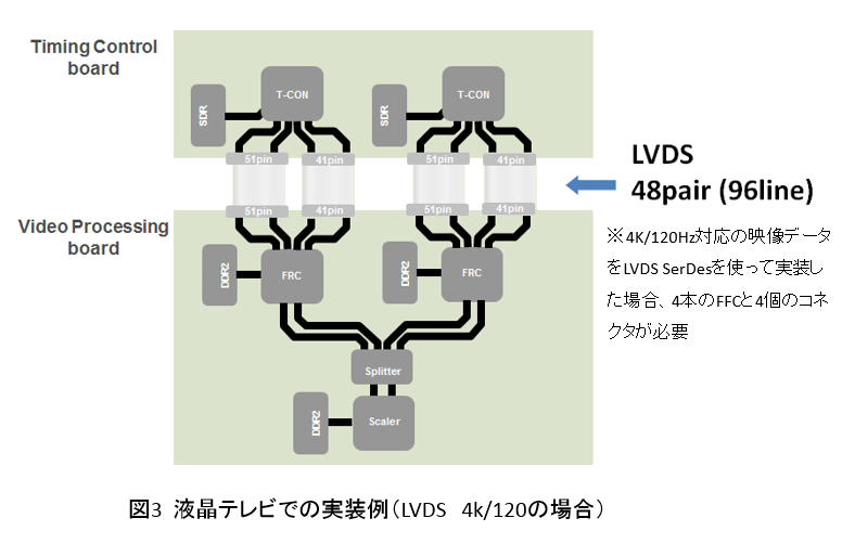 さらに、画面寸法が42インチ程度に大きくなると、画像処理ボードとT-CONの距離は50cm~70cmと長くなる。LVDS SerDesでは、信号振幅の減衰や信号間のスキューが問題になり、正しく伝送できなくなる可能性が出てくる。加えて、不要輻射(EMI)の問題も顕在化してくる。もちろん、ケーブルを低損失化してスキューを制御しシールドを施せば、こうした問題に対処できる。しかし、コストが大きく上昇してしまう。