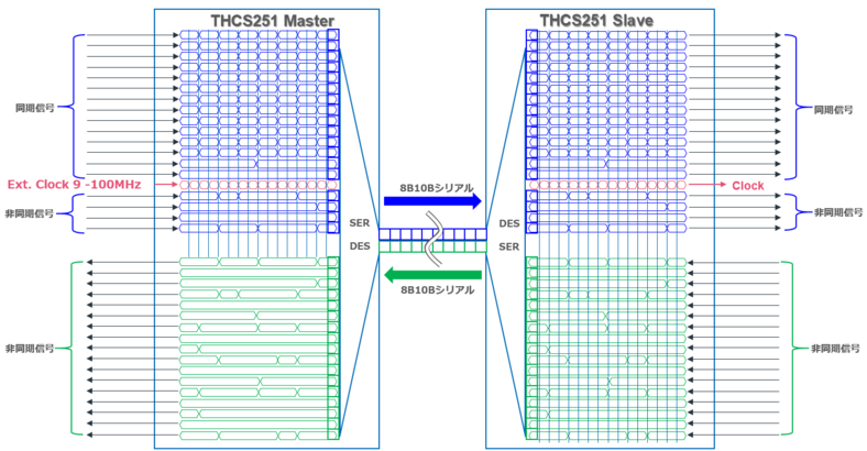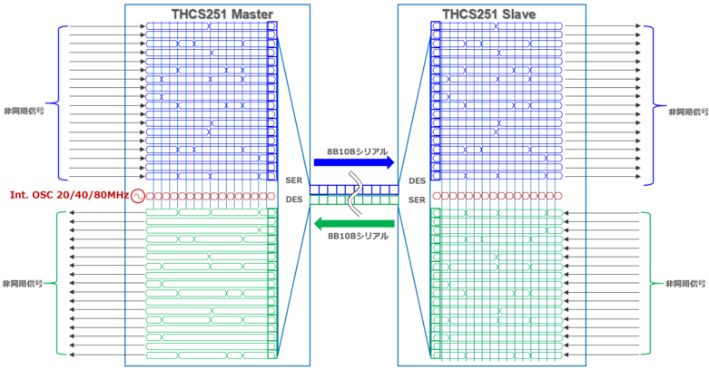 このモードでは、外部からの基準クロック入力などは不要です。多くの非同期信号入力をオーバーサンプリングしてシリアライズ⇒デシリアライズして出力します。これをマスタ⇒スレーブ、スレーブ⇒マスタの双方向で行います。