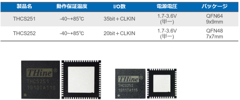 まとめたいGPIOの本数およびパッケージサイズにより2種類の製品をラインナップ。35bit対応のTHCS251と20bit対応のTHCS252があります。