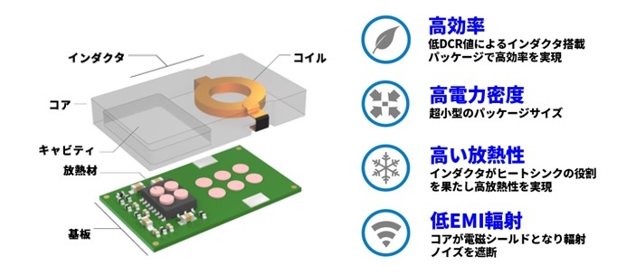 図1 専用インダクタを採用した降圧型DC-DCコンバータ・モジュールの構造と4つの特徴