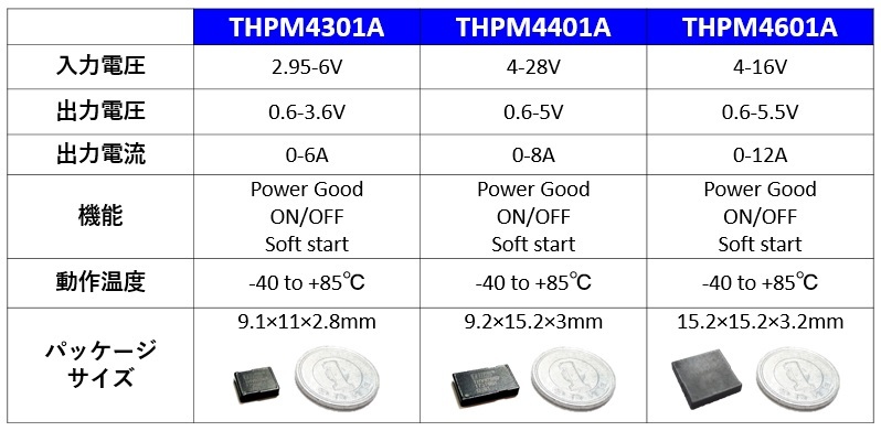 今回は、最大出力電流が異なる3製品を用意した(表1)。6A出力品「THPM4301A」と、8A出力品「THPM4401A」、12A出力品「THPM4601A」である。6A出力品の入力電圧範囲は2.95~6V。入力の電力源として5Vの中間バス電圧を想定する。8A出力品の入力電圧範囲は4~28V。12A出力品は4~16Vである。いずれも12Vの中間バス電圧を入力の電力源に想定する。外形寸法は、6A出力品が9.1mm×11mm×2.8mm、8A出力品は9.2mm×15.2mm×3mm、12A出力品は15.2mm×15.2mm×3.2mmといずれも小さい。スイッチング周波数は、6A出力品と8A出力品が約750kHz、12A出力品が約1MHzとなる。