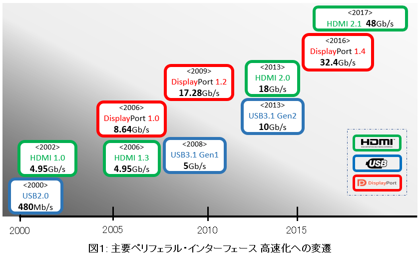 さらに、パソコン本体やDVD/Blue-Rayプレーヤー・レコーダー、セットトップボックスなどの映像再生機器とディスプレイ、プロジェクターなどを結ぶHDMI(High Definition Multimedia Interface)でも高速化の流れは加速している。2013年に規格化されたHDMI 2.0ではデータ伝送速度が18Gビット/秒(6Gビット/秒×3レーン)だったが、そのわずか4年後の2017年には、HDMI 2.1として48 Gビット/秒(12Gビット/秒×4レーン)に高められている。
