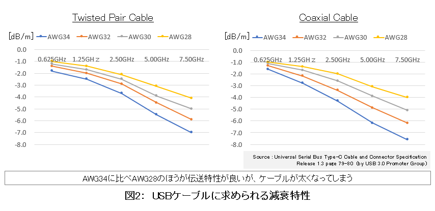 例えば、USB 2.0では5mの伝送距離を確保できたが、USB 3.2 Gen1では2~3mしか伝送できない。しかも、伝送距離を何とか確保するために、高周波成分の減衰が穏やかな直径が太いケーブルを使わざるを得ない(図2)。
