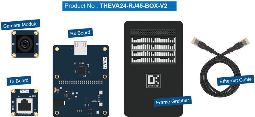 「THEVA24-RJ45-SET-V2」には、カメラ側のTxボード、グラバーボード側のRxボード、そしてイーサネット・ケーブルがセットとして同梱されており、TxボードおよびRxボードには、ザインエレクトロニクスのMIPIインターフェース変換SerDesチップセットであるTHCV241A-P(トランスミッタIC)、THCV242A-P(レシーバIC)が搭載されている。
