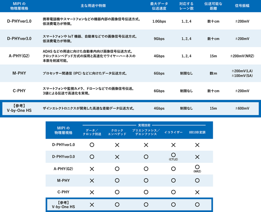 V-by-One HSはMIPIと同様に、低電圧振幅の差動伝送技術を使った高速インターフェース技術である。しかし、MIPIとは異なりモバイル機器に特化しておらず、汎用的な高速インターフェース技術である。電圧振幅は±600mVであり、クロックエンベデッド方式を採用している。さらにデエンファシス技術とイコライザー技術を採用しているため、最大データ伝送速度は1レーン当たり4Gビット/秒と高く、伝送距離は最長約15mと長い。従って、D-PHYに対応したMIPIが抱える伝送距離の問題を一気に解決できる。