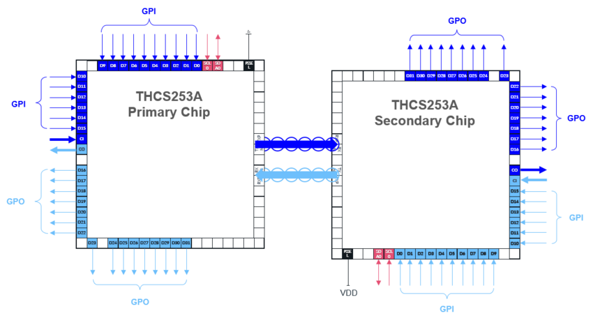 具体的に説明しよう。THCS253A/THCS254Aを電子機器に適用する場合、同じチップ(IC)を2個用意して、一方をプライマリ・チップに、もう一方をセカンダリ・チップにPSSEL端子を使って指定する。扱えるGPIOの本数はTHCS253Aが最大32本、THCS254Aが最大20本である。例えば、THCS253Aの場合、デフォルトでGPI(汎用入力)が16本と、GPO(汎用出力)が16本という端子構成に設定されている(図1)。