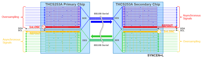 次に、もう1つの大きな変更である同期/非同期モードの導入について説明しよう。従来品であるTHCS251/THCS252は同期モードしか使えなかったが、今回のTHCS253A/THCS254Aでは同期モードと非同期モードの両方を利用できるようになった。使用するモードは、セカンダリ・チップの端子設定でユーザーが選択できる。