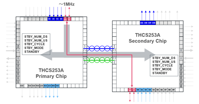 3つ目は、「スタンバイ機能」である(図9)。今回の後継品では、I2Cを介して内部レジスタを書き換えることでスタンバイ状態に移行、もしくは離脱できるようにした。プライマリ・チップ側から、プライマリ・チップのスタンバイ状態への移行/離脱はもちろんのこと、セカンダリ・チップの移行/離脱も設定可能だ。