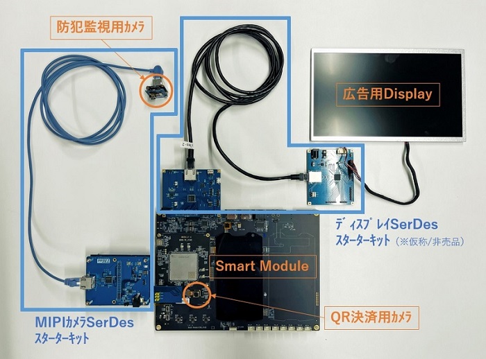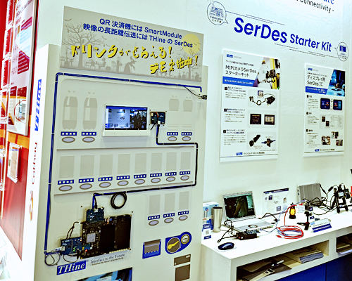 この2つの開発項目をわずか3か月半で終わらせなければならない。しかし、宇野に焦りはほとんどなかった。なぜならば、ザインエレクトロニクスには「MIPIカメラSerDesスターターキット(以下、スターターキット)」が用意されていたからだ。今回は、画像インターフェースを延ばす手段として「V-by-One HS」仕様、もしくは「V-by-One HS II(*1)」仕様に準拠したSerDesチップ(シリアライザICとデシリアライザIC)を使った。具体的には、Smart Moduleと監視/防犯用カメラを接続する画像インターフェースにはシリアライザIC「THCV241A」とデシリアライザIC「THCV242A」を、Smart Moduleと液晶パネルをつなぐ画像インターフェースには、タッチパネル向けソリューションとして最適なシリアライザIC「THCV333」とデシリアライザIC「THCV334」を適用した。