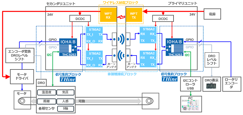 このデモ機は、モータ制御部とモータ駆動部の接続にコネクタを用いず、無線で伝送する用途に向けたものだ(図1)。シリアル・インタフェースICには「THCS253」を使った。いわゆる「IOHA:B」と呼ぶ製品だ。