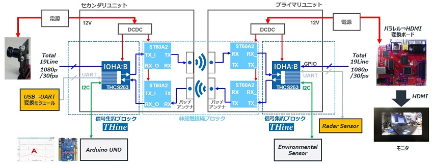 試作したデモボードの詳細を説明しよう。採用したカメラは、解像度が1080Pでフレーム速度は30フレーム/秒である。撮影した映像したGPIOを介して、プライマリ側のTHCS253に入力する。そこで2ペアの差動信号に変換し、セカンダリ側のTHCS253に無線伝送し、その画像データをHDMI経由でモニタに送って表示する。無線伝送には、60GHzのミリ波を利用する近距離無線通信トランシーバIC(STマイクロエレクトロニクスの「ST60A2」)を使った。