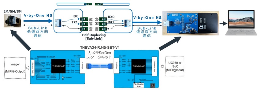 デモボードには、当社の組み込みカメラ向けSerDesスターターキットを採用した。このスターターキットは、MIPI CSI-2とV-by-One HSのブリッジチップセットである「THCV241A」を搭載した送信ボードと、「THCV242A」を搭載した受信ボードからなる。今回は、V-by-One HS信号を送るシリアル・インタフェースを途中で切断し、そこに近距離無線通信トランシーバIC(STマイクロエレクトロニクスの「ST60A2」)を入れた。こうしたカメラ・モジュールとモニタの間を無線伝送化し、電気的な絶縁を実現した。なお制御信号などを送る低速のSub-Linkにも、近距離無線通信トランシーバICを挿入して無線伝送化を実現している。