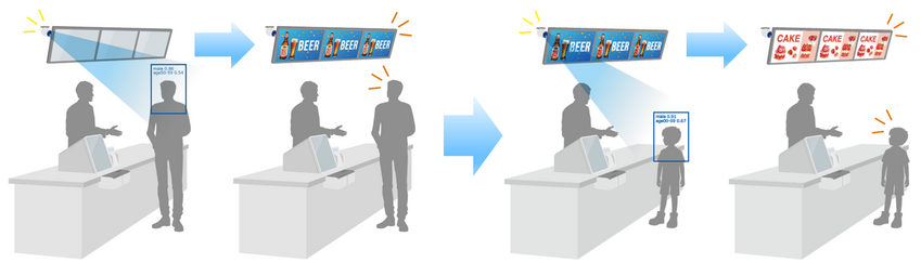 そして、レジ前にやってきた来店客をカメラ・モジュールで撮影し、その映像を人工知能(AI)で処理することで、その来店客の属性情報、すなわち性別や年齢などの推定情報を取得する。そして、その属性情報を基に、最も効果が高いであろう広告をデジタル・サイネージに表示するわけだ。