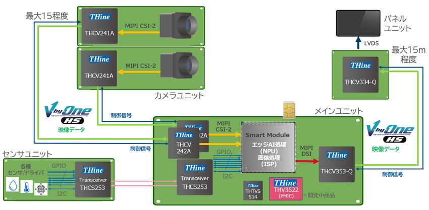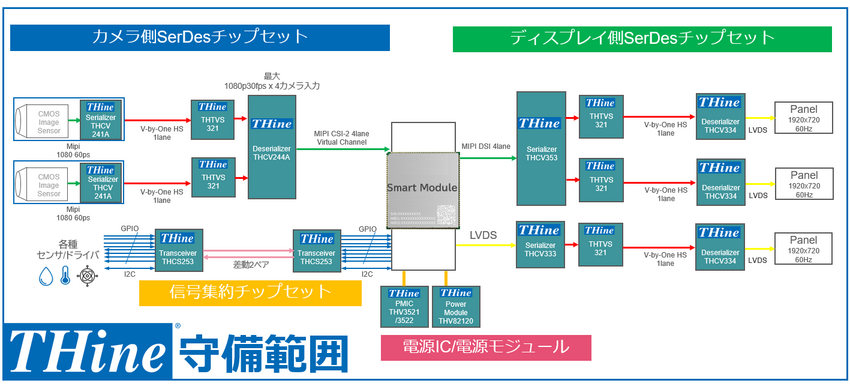 一方で、スマートモジュールとディスプレイとの接続には、V-by-One HS対応トランスミッタIC「THCV353-Q」と、レシーバIC「THCV334-Q」が最適だ。