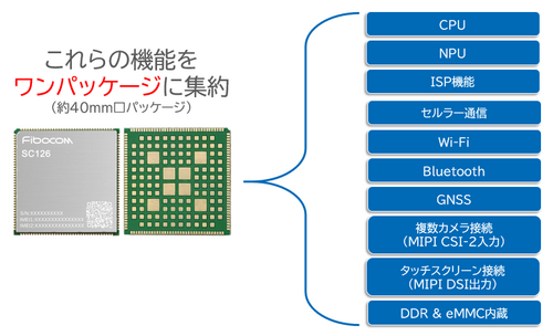 それでは、当社は具体的にどのような製品や技術を提供できるのかについて説明しよう。4つのキー・テクノロジのうち、1つ目のSoCと2つ目の無線通信技術については、中国Fibocom Wireless社(以下、Fibocom)のスマートモジュールの形で提供できる。スマートモジュールとは、セルラー通信やWi-Fiなどの無線通信機能や、Bluetooth機能、プロセッサ、メモリ、ISP(Image Signal Processor)機能、タッチスクリーン・インタフェース(MIPI DSI出力)、カメラ・インタフェース(MIPI CSI-2)などを1つのパッケージに収めたものだ(図3)。