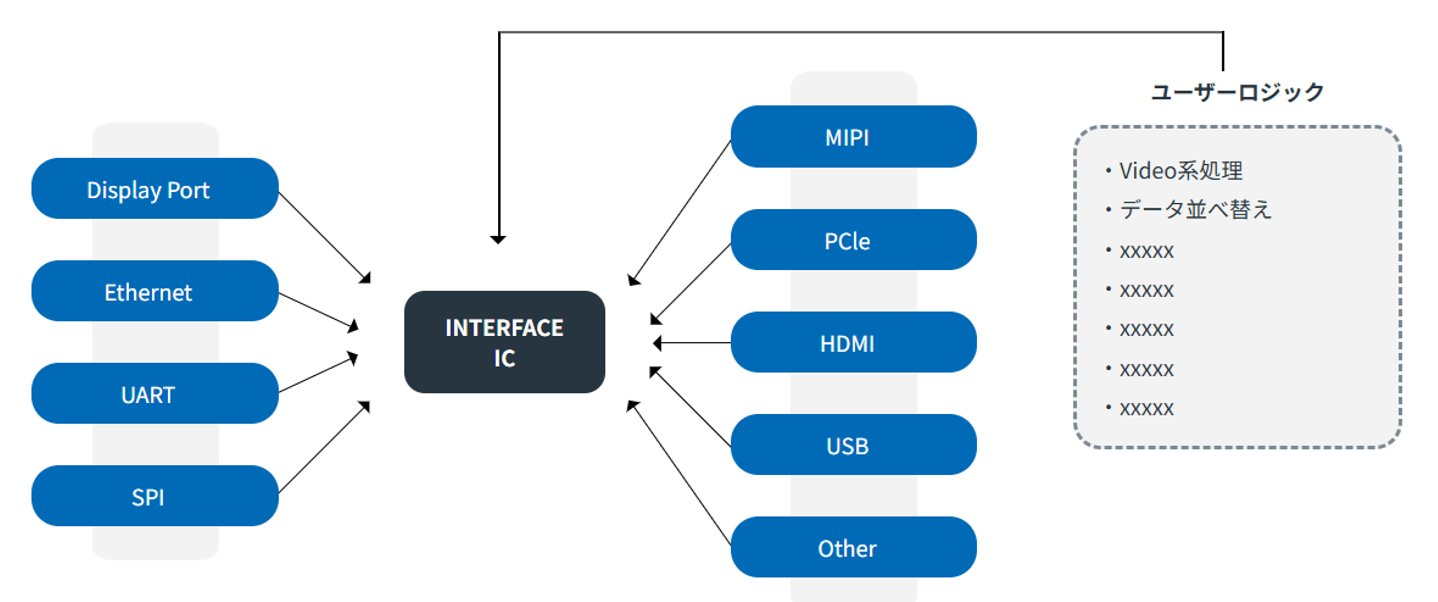 カスタム開発トップにあるお好きなUser Logicをお入れすることに加え、入力・出力のインターフェース(伝送規格)も変更(選択)可能です。