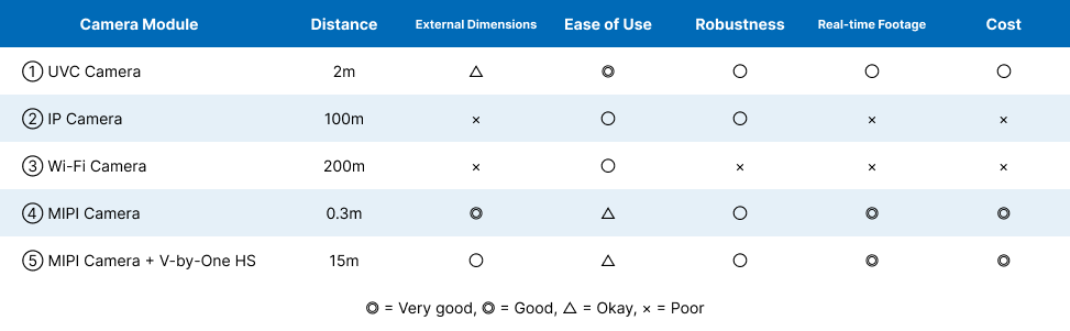 Wi-Fi cameras are positioned as a wireless LAN (Wi-Fi) version of the above IP camera. Thus, this allows wireless communication between the camera module and the monitor displaying the images. This wireless communication is the biggest advantage. Moreover, the connection distance can be long, up to approximately 200 m, making it highly user-friendly. The disadvantage of these modules is that, as with IP cameras, real-time transmission is not possible. Furthermore, there is a risk of disconnection depending on the surrounding environment, and the robustness of the connection is relatively low, raising security concerns. In addition, the large external dimensions and high cost for a camera module to be incorporated into industrial equipment may be cited as disadvantages.④ MIPI Cameras