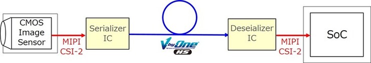 MIPI cameras are modules that use MIPI CSI-2, a transmission standard that connects the camera to the SoC inside mobile devices, such as smartphones, as its video output interface. The advantage of using these modules is that the external dimensions are small, and the cost is low because they were originally intended for mobile devices. Further advantages include the possibility of real-time transmission and the robustness of the connection. On the other hand, there are two disadvantages. One is that the connection distance is short, being 30 cm at most. This makes it difficult to apply to industrial equipment where the distance between the camera module and the video processor is far. The other disadvantage is the need to develop driver software and write register code when integrating into industrial equipment. Unlike UVC and IP cameras, MIPI cameras cannot display video footage by simply connecting the camera.However, the disadvantages related to connection distance can be eliminated to some extent if appropriate measures are taken. Specifically, MIPI cameras can be combined with the V-by-One HS high-speed serial interface from THine Electronics ((5) MIPI Camera + V-by-One HS in Table 1). This combination would extend the connection distance to about 15 m (Fig. 2). Moreover, there are few disadvantages that arise from this combination. The only disadvantage is a slight increase in component and development costs. The advantages of small external dimensions and the robustness of the connection remain unchanged.
