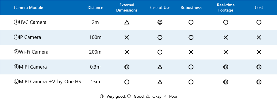 Wi-Fi cameras are positioned as a wireless LAN (Wi-Fi) version of the above IP camera. Thus, this allows wireless communication between the camera module and the monitor displaying the images. This wireless communication is the biggest advantage. Moreover, the connection distance can be long, up to approximately 200 m, making it highly user-friendly. The disadvantage of these modules is that, as with IP cameras, real-time transmission is not possible. Furthermore, there is a risk of disconnection depending on the surrounding environment, and the robustness of the connection is relatively low, raising security concerns. In addition, the large external dimensions and high cost for a camera module to be incorporated into industrial equipment may be cited as disadvantages.④ MIPI Cameras