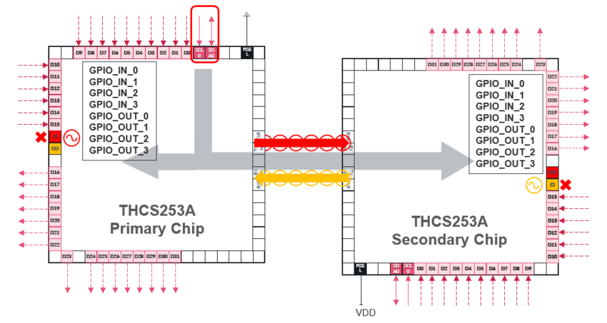 Let's get into the details. When applying the THCS253A/THCS254A to electronic devices, two identical chips (ICs) are prepared—one is designated as the primary chip and the other as the secondary chip—using PSSEL pins. The maximum number of GPIOs that can be handled is 32 for the THCS253A and 20 for the THCS254A. For example, the THCS253A has a default pin configuration of 16 GPIs (general-purpose inputs) and 16 GPOs (general-purpose outputs) (Fig. 1).