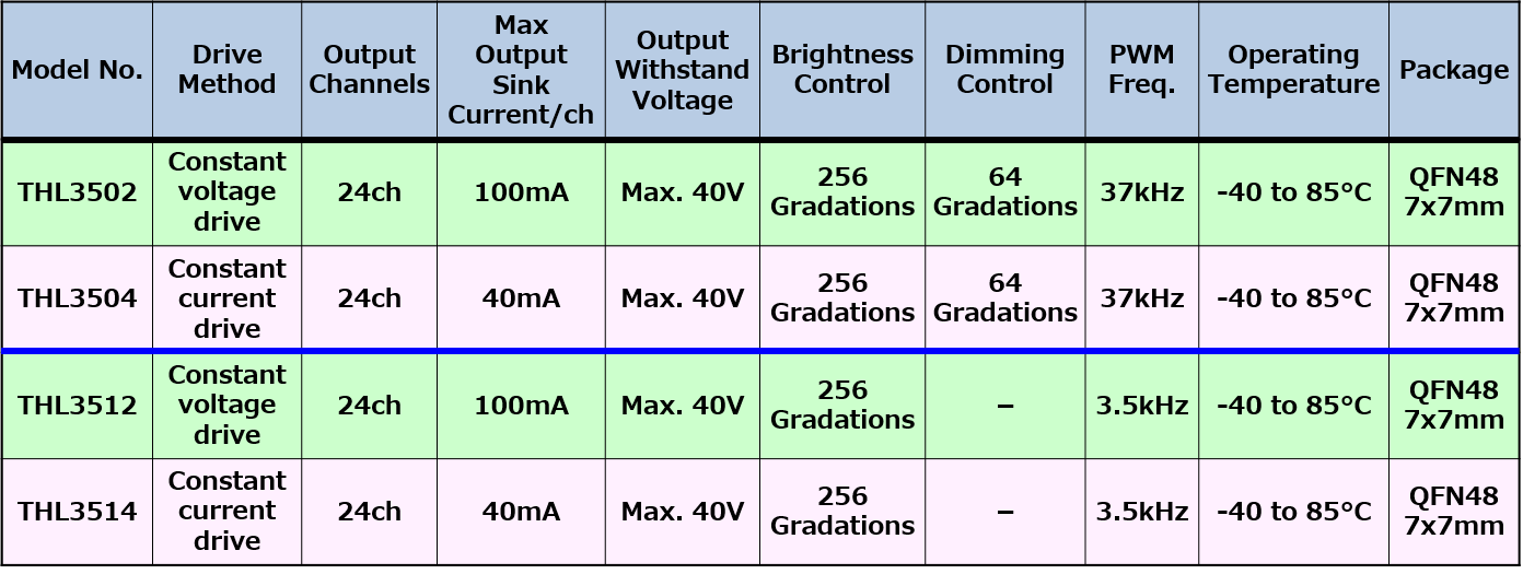 THine Electronics' driver ICs have 24 output channels, and there are a total of four products in the lineup with differences in the driving method (constant voltage drive/constant current drive) and PWM signal frequency (Table 1). The PWM signal frequencies are 37 kHz and 3.5 kHz, and the 3.5 kHz product (THL3512/THL3514) can keep EMI lower.