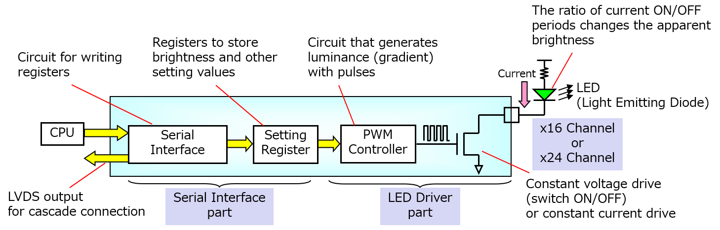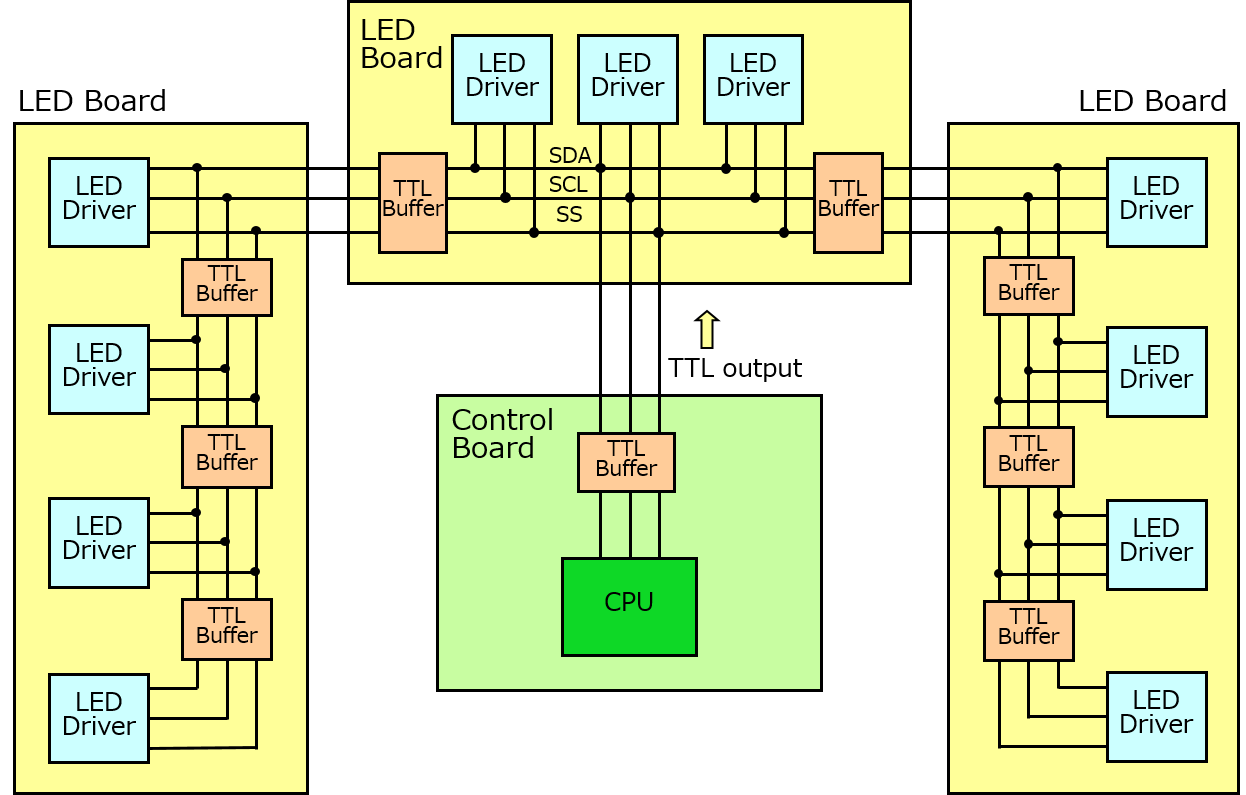 The problem was solved by adopting Low Voltage Differential Signaling (LVDS) as the interface technology to connect the CPU and multiple LED driver ICs (Fig. 3)
