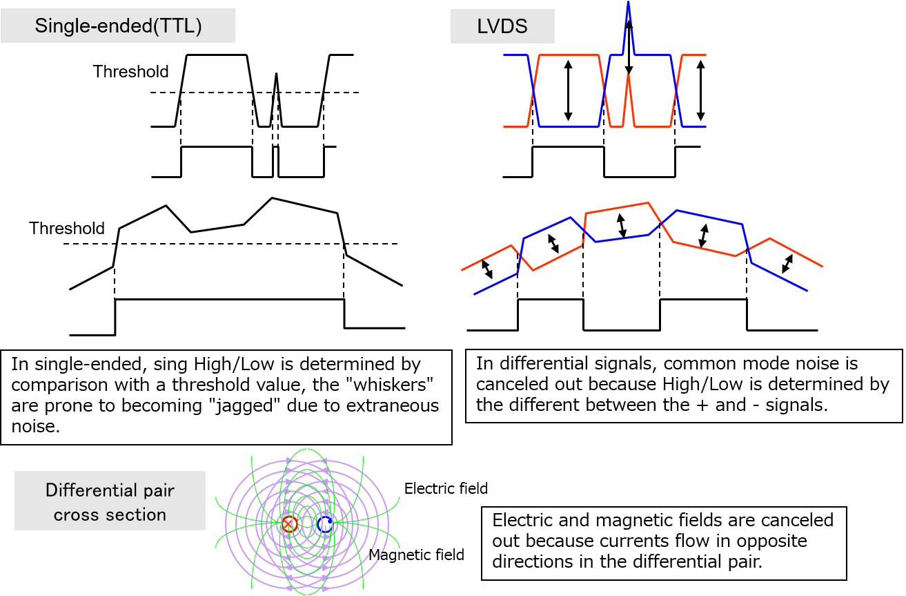 Generally, noise caused by fluctuations in ground potential or power supply is called common noise. Thus, LVDS is exceptionally resistant to common mode noise (however, in some cases where external noise is difficult to deal with, it is necessary to adapt to the equipment environment by inserting filter elements, etc.).