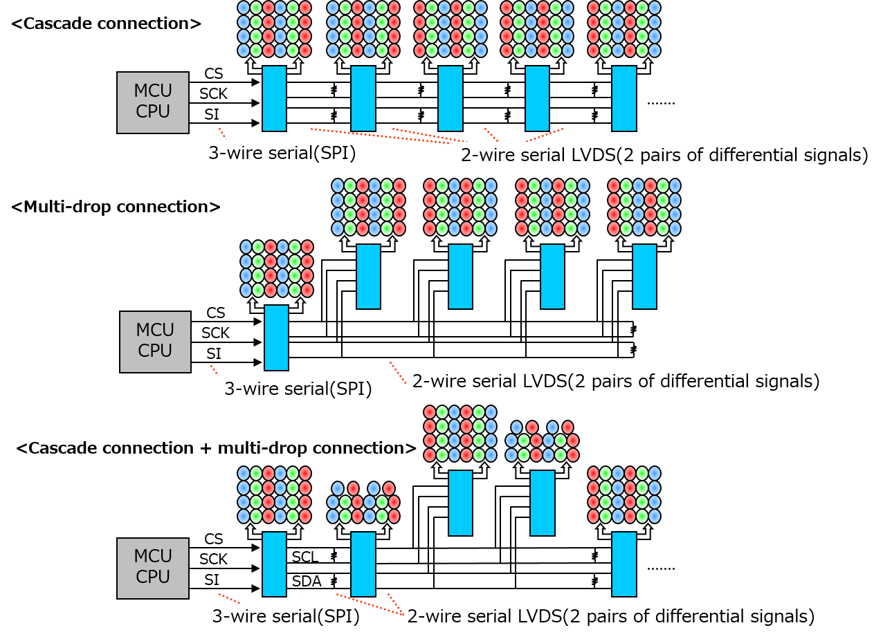 LED driver ICs equipped with LVDS have another significant feature. That is the very high design flexibility in the method of connecting LED driver ICs.