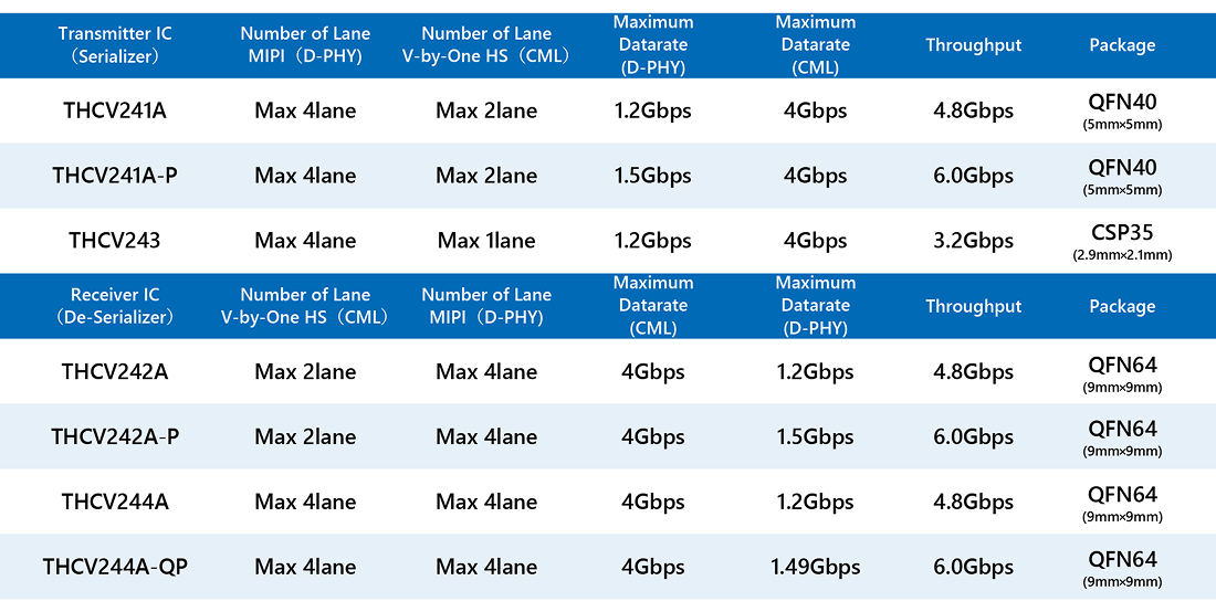 Choose from 7 specialized products combining MIPI® and V-by-One® HS, optimized for various transmission speeds, lane counts, and system architectures.
