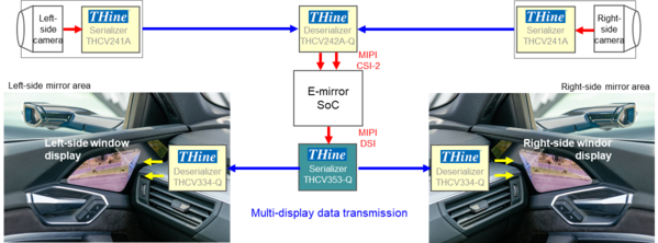 For example, in the automotive market, the THCV353-Q enables a simple configuration of a system that displays images from left-side and right-side cameras in the side displays installed in the left and right windows.