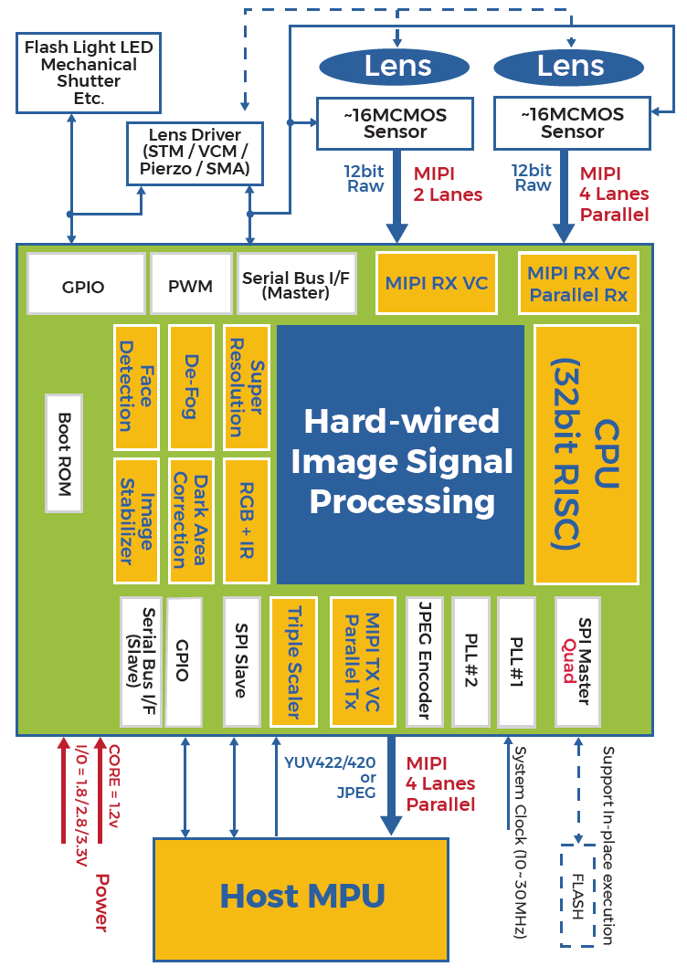 The THP7312/THP7312-P has selectable input ports connecting to CMOS image sensor. One is 1Gbps/Lane MIPI CSI-2 receiver and the other is 12bit parallel input. MIPI CSI-2 receiver has 2 ports, one port consists of 4lane mainly connected to main camera, and the other consists of 2lane mainly connected to sub camera. The THP7312/THP7312-P provides a solution to implement a mobile system with resent trend of higher resolution sub camera, by interfacing both of main and sub cameras by one chip. The THP7312-P has selectable output ports connecting to host processors. One is 1.2Gbps/Lane MIPI CSI-2 4lane transmitter and the other is 8 or 16bit parallel output. The THP7312/THP7312-P receives and transmits MIPI interleaved data stream with Data Types (DT) or multi Virtual Channel identifiers (VC). The THP7312/THP7312-P can transmit still JPEG data, preview images, and thumbnail images simultaneously. Users can utilize MIPI interleaving functionality to realize various applications such as zero shutter lag, simultaneous capture of movie and still images. THP7312/THP7312-P can control 3A functions for image sensors of IR, WDR, or HDR, by utilizing MIPI interleaving functionality.