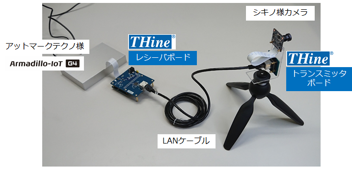 上記ご紹介のスターターキットを活用し、アットマークテクノ様のArmadillo-IoT G4をプラットフォームとして、またシキノハイテック様のKBCR-S08MMをカメラとして各々組み合わせ、AI物体選別デモ機を作りました。カメラ映像データを長距離伝送し、その映像を用いてAIで物体選別を継続的に行う様子をご覧頂くことができます。是非ブースへ足をお運びください。