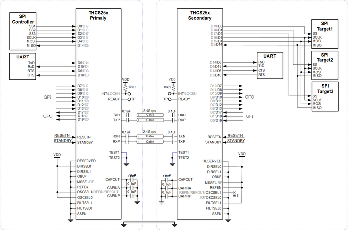 下記ブロック図においてUARTデバイスの入力セットアップホールド時間が10ns、THCS25xの内部オシレータ80MHz設定(※tOSC=max.15.7ns)において、ボーレート1MbpsのUART通信をする場合の許容されるボーレート誤差は上式より約4.3%と言うことになります。また最大ボーレート誤差が4%の場合、ボーレートは最大2.56Mbpsと言うことになります。ただし環境によってはTransition timeなど上記計算式以外の要因も考えられるため、上記計算は目安と考え十分にマージンを持ってお使いください。