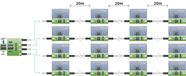 경기장이나 빌딩의 안내 표시 등에 사용되는 대형 LED 디스플레이는 32×32나 64×64의 매트릭스 LED 모듈을 가로・세로로 배열함으로써 임의 해상도의 디스플레이를 구축할 수 있습니다. 위 그림에서는 64×64의 LED 모듈을 세로 12대, 가로 16대의 합계 192대를 배열하여 XGA(1024×768)의 디스플레이를 구성하고 있습니다.
