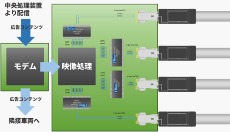 컨텐츠 수신・차량내 전달부에서는 중앙 처리부에서 보내오는 영상 컨텐츠를 판독해 각 LCD 표시부에 최적인 영상 처리를 실시한 후에 전달합니다. 영상 처리 회로에서 출력된 LVDS 영상 신호(525Mbps×8ch, Clock×2ch)는 THCV215에 의해 2.25Gbps×2ch의 V-by-One HS 신호로 변환된 LCD 표시부에 송출됩니다.