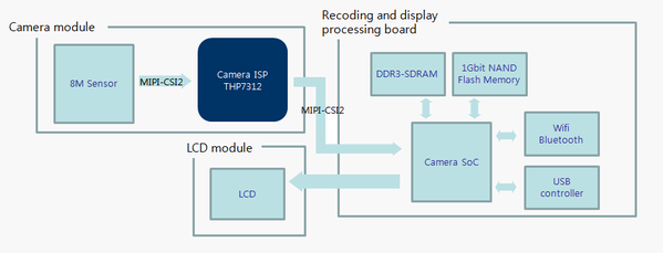 Pipeline화 된 전용 소프트웨어 엔진에 의해 영상신호 고속처리가 가능한 카메라 이미지처리 프로세서(ISP)가 준비되어 있습니다. 고성능의 Auto Exposure / Auto Focus / Auto White Balance를 실현하는 전용회로를 탑재하고 있습니다. 또한, Noise Reduction기능을 비롯한 자사 개발 영상처리 블록에 의해 CMOS센서로부터 최고 화질을 얻을수 있습니다.