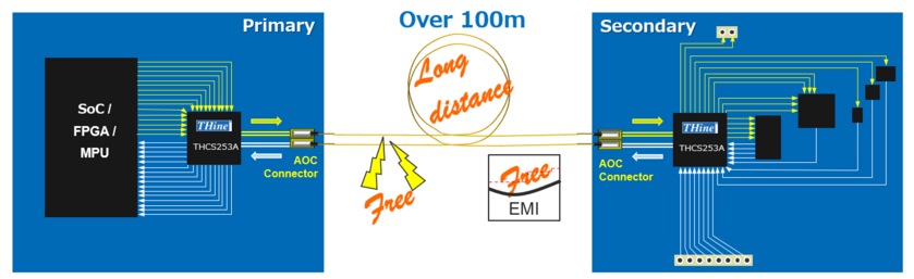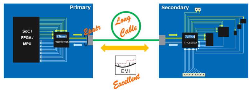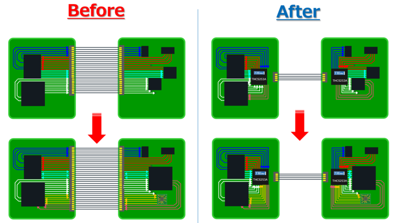 첫 번째는 Parallel전송을 Serial전송으로 대체할 수 있기 때문에 배선 케이블 수를 줄일 수 있다는 점이다. 예를 들어, THCS253A의 경우 34개(GPIO 32개 + 1계통의 I2C) 신호라인을 불과 차동 2페어(4개)으로 줄일 수 있다. 즉, 배선 케이블 수를 최대 88%까지 줄일 수 있다는 계산이 나온다. 그 결과 34개의 배선 케이블이 통과할 수 없었던 좁은 틈새도 통과할 수 있게 된다. 예를 들어, 잉크젯 프린터 등 전자기기의 소형화에 기여할 수 있다.
